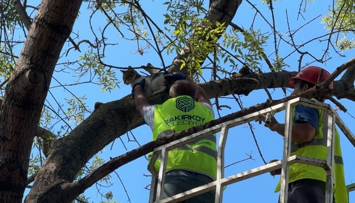 3 gündür ağaçta mahsur kalan kediyi Bakırköy Belediyesi ekipleri kurtardı