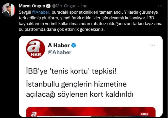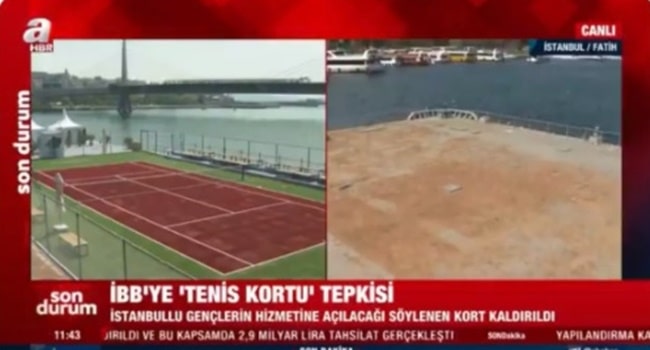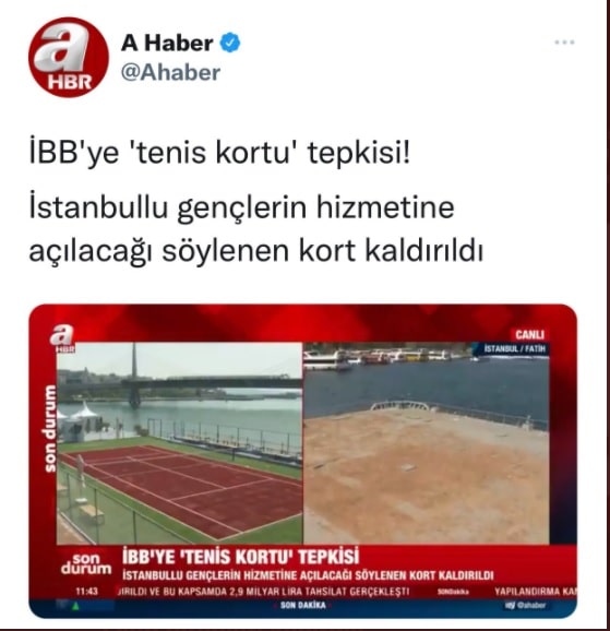 A Haber “Haliç’teki tenis kortu kaldırıldı” haberiyle ilgili İstanbul Büyükşehir Belediyesini hedef aldı.