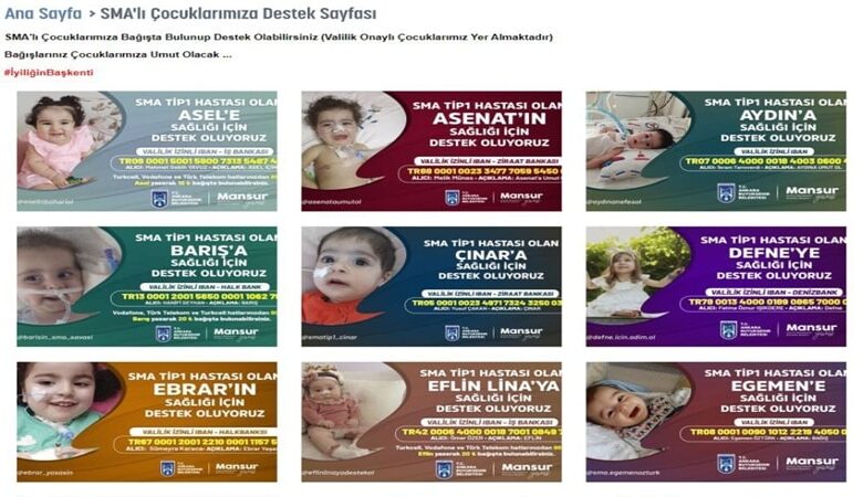 Ankara Büyükşehir Belediyesi, Spinal Musküler Atrofi (SMA) hastası çocukların valilik izinli bağış kampanyalarının bilgilerini resmi internet sitesinden yayımlamaya başladı. “ankara.bel.tr” internet adresinde yer alan ‘SMA’lı Çocuklarımıza Destek Sayfası’ linki üzerinden hayırsever vatandaşlar, tedavi masraflarının karşılanmasına destek olmak için açılan banka IBAN numaralarına ulaşabilecek.