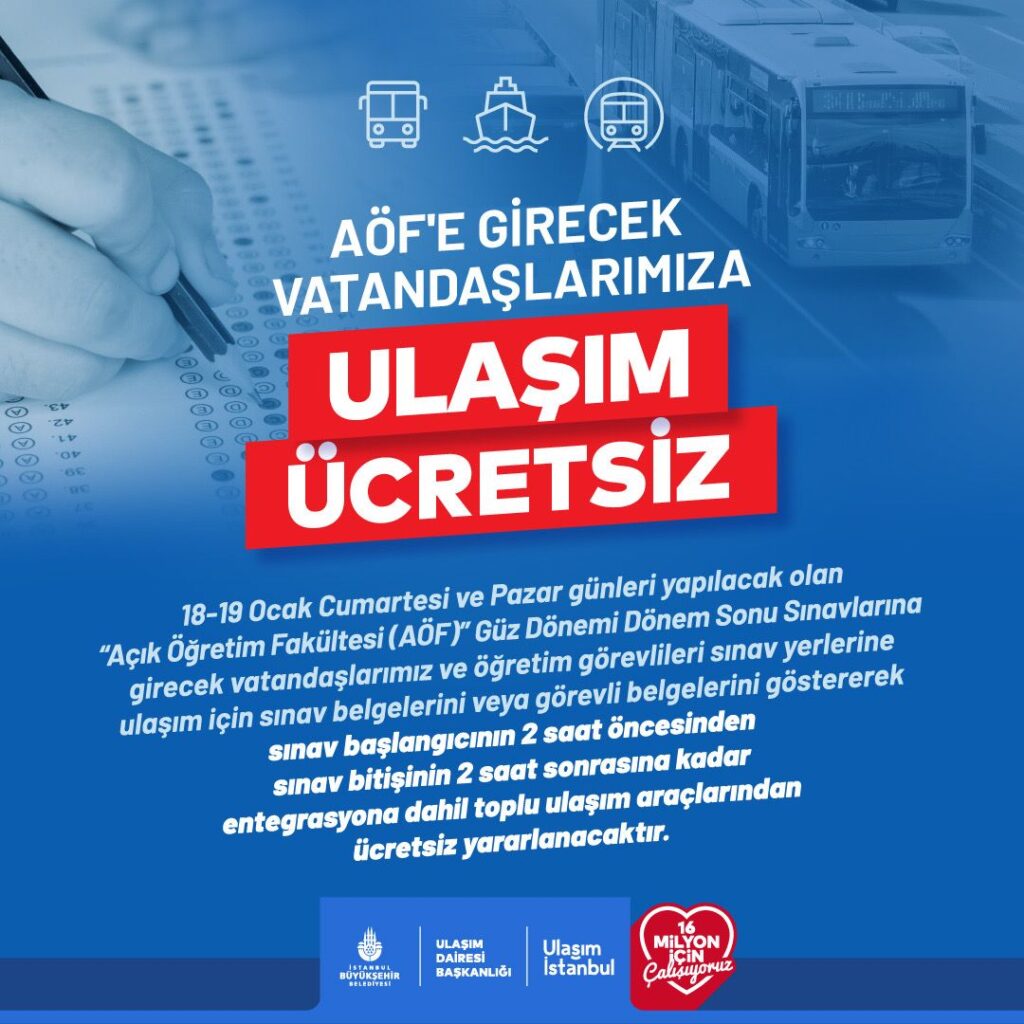 18 Ocak-19 Ocak günlerinde yapılacak olan “Açıköğretim Fakültesi (AÖF)” Güz Dönemi Dönem Sonu Sınavlarına girecek adaylar ve öğretim görevlileri, sınav belgelerini göstererek entegrasyona dahil toplu ulaşım araçlarından ücretsiz yararlanabilecek.