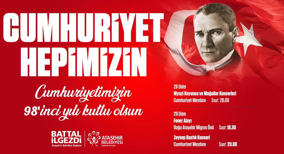 Tüm vatandaşları Cumhuriyet Bayramı kutlamalarına davet eden Ataşehir Belediye Başkanı Battal İlgezdi, “Geçtiğimiz yıl Covid-19 salgını nedeniyle meydanlarda, sokaklarda bir arada olamamıştık. Ama bu yıl, Atamızın bizlere armağan ettiği 29 Ekim Cumhuriyet Bayramı’nı tüm coşkusuyla meydanlarımızda hep birlikte, çok sayıda etkinlikle kutlayacağız. 98 yıldır parlayan, milletimizin geleceğini aydınlatan Cumhuriyetimizin ilelebet yaşayacağını biliyor, hepimizin Cumhuriyet Bayramı’nı kutluyorum. ‘Cumhuriyet Hepimizin’ diyerek bayramımızı kol kola, omuz omuza kutlamak için sizleri şölenimize bekliyorum” şeklinde açıklamada bulundu.