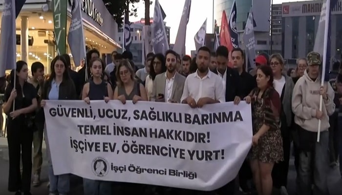 “Güvenli, ucuz, sağlıklı barınma temel insan hakkıdır. İşçiye ev, öğrenciye yurt” yazılı pankart açılan eylemde, “Taciz değil, barınmak istiyoruz”, “Tacizsiz yurtlar, tacizsiz Türkiye” ve “KYK uyuma, öğrencine sahip çık” sloganları atıldı.