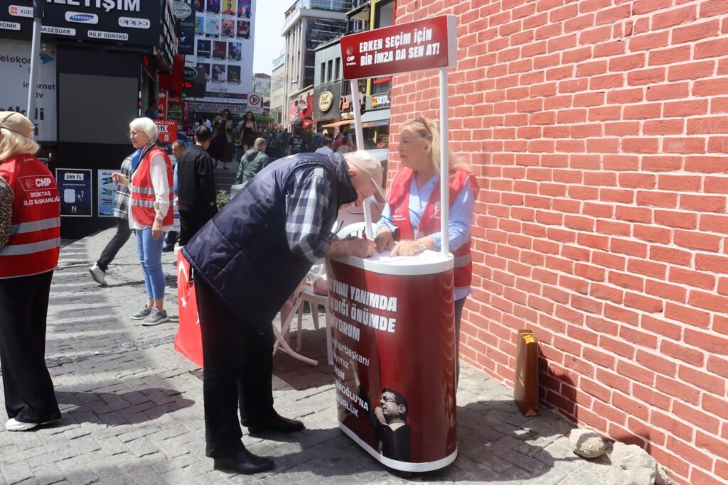 Esenyurt Belediye Başkanı Ahmet Özer’in göz altına alınması ve tutuklanması ile CHP’li Belediye başkanlarına yönelik saldırı başlatan tek adam rejiminin Ekrem İmamoğlu’nun tutuklaması ile zirve yapan hukuksuz uygulamaları ile büyük bir kaosa sürüklenen ülkenin bu zor durumdan tek çıkış yolunun erken seçim olduğu inancı ile CHP tarafından ülke genelinde başlatılan “adayım yanımda, sandığım önümde” imza kampanyası dahilinde CHP Beşiktaş İlçe Başkanlığının 08 Mayıs 2025 Perşembe günü İlçe Başkanlık Binası önünde açtığı imza standına vatandaştan büyük ilgi vardı.