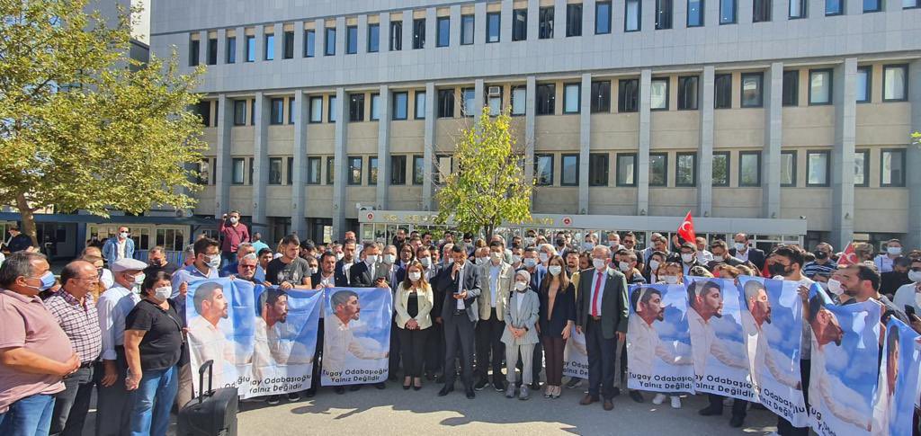 Denizli Adliyesi önünde toplanan CHP Denizli İl örgütü, “Tugay Odabaşıoğlu yalnız değildir” pankartı açarak basın açıklaması yaptı.