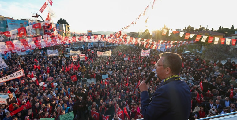 “Bakın, İstanbul’da Adalar İskelesinin üstünde muhteşem, 600-700 metrekare bir yer var. Oraya İstanbullular giremiyor. İstanbul Büyükşehir Belediyesi giremiyor. Zabıta ile gidiyorsunuz karşınıza polis dikiyorlar. Çünkü 30 yıllık protokol yapmışlar, TÜRGEV’e vermişler. Geçen günlerde Eskişehir’deki AKP adayı ağzındaki baklayı çıkardı. Hele şu CHP’deki belediyeyi bir alalım diyor. Bu belediyelerin kaynak ve imkanlarını bütün vakıflarımıza açacağız diyor. Kime açacakmış? TÜRGEV, TÜGVA, Okçuluk Vakfı ve Ensar Vakfına açacakmış. Bunlar gelemezler. İzmirli onlara geçit vermez ama şunu bilin. Allah muhafaza bir korku filmi gibi gelseler, ilk işleri Karşıyaka İskelesi TÜRGEV’e, Alsancak İskelesi TÜGVA’ya, Paraşüt Kulesi Okçuluk Vakfına, Asansör Ensar Vakfı’na verilir, 30 senelik protokolleri yaparlar. Bu yüzden bunların İzmir ile ilgili ne sevgileri, ne ifadeleri, ne vaatleri samimidir. Bunların ne dediklerine bakmayacaksın, başka şehirlerde ne yaptıklarına bakacaksın.”