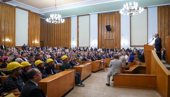 “Ayrıca bu iktidar 24 yıldır tam 23 büyük işçi görevini sudan sebeplerle yasakladı. Ya anayasa Cumhurbaşkanına yetki veriyor, ‘Milli güvenliği tehdit eden hususlarda’ diyor. Yani ne biliyor musun? Makine Kimya Enstitüsünde sendika olacak, tam savaşa girmişiz MKE’deki işçiler ‘Ya biz tüfek üretmiyoruz’ diyecekler, orada devreye girecek Cumhurbaşkanı. Diyecek ki ‘Milli güvenlik tehdit altında’, olmaz. Ya da yok ama; jandarmanın sendikası olacak, askerin sendikası olacak, o süreçte tam kritik bir anda eyleme gidecek, greve gidecek, onu yasaklayacaksın. Milli güvenliğin tehdit edildiği hususlarda deyip; işçilerin grevini, metal işçilerinin grevini, maden işçilerinin grevlerini ertelediler. 200 bin işçinin grev yasağı yüzünden işten olmaya direnmesinin önüne geçtiler, onların işlerinin elinden alınmasına sessiz kaldılar, arka çıktılar. Bugün Türkiye’de işçilerin yüzde 14’ü sendikalı. 7’si özel sektörde yüzde 7’si kamuda. Kamuda örgütlenen ‘Örgütlenme’ diyen yok. Yani özel sektörde örgütlenebilen yüzde 7. Özel sektör ve kamuda grevli toplu sözleşmeli sendikal haklara sahip olanların oranı; sadece yüzde 9. Yıl 2026, yüzde 9. Yıl 1980, 11 Eylül 1980, darbeden bir gün öncesi bütün sendikalar kapatılmadan bir gün öncesi dört işçiden üçünün grevli toplu sözleşmeli sendikal hakları var. İşte bir yanda ‘Efendim biz darbelerle hesaplaşacağız, darbelerin ürünlerinden kurtulacağız, yükü kaldıracağız, sendikal örgütlenmenin önünü açacağız. 1 Mayıs’ı serbest yapacağız’ diyen Adalet ve Kalkınma Partisi, şimdi YÖK’ün etinden, sütünden, yününden yararlanıyor. Yıllarca geldiği gün siyasi partilere uygulanan barajı sıfırlayacağını söylemişti. Etinden, sütünden yıllarca yüzde 10 olarak yararlandı. ‘1 Mayıs’ı bayram yapacağım’ demişti, hepimizin oylarıyla güya o sözü tuttu. Bakın AK Parti İstanbul İl Başkanlığı bunu ‘Artık 1 Mayıs hem bayram hem de Taksim’de’ diye 2010 yılında billboardlarla duyurdu. 2010 Taksim var, 2011 var. 14 yıldır Taksim yasak. 1 Mayıs’ı önce bayram edip sonra bayramı zehir edenlere Taksim’i önce serbest edip 14 yıldır Taksim’den korkanlara inat; 1 Mayıs bayram gibi bayram olacak, Taksim sonuna kadar serbest olacak. AK Parti’nin kara düzeni Türkiye’de 100 işçiden 91’inin grev yapma hakkından, sendikalı olma hakkından uzak tutmaktadır. 70’lerin Cumhuriyet Halk Partisi’nin işçi haklarını savunan, sendikal özgürlükleri savunan, işçilerin sigorta alanlarında geniş haklar elde etmesini savunan ve Türkiye’de iklimi değiştiren; hem emek mücadelesi hem de Cumhuriyet Halk Partisi, Karaoğlan’ın halkçı, emekten yana siyaseti dört işçiden üçünü bu haklara kavuşturmuştur. 24 yıldır iktidardalar. 100 işçiden 91’i bu haklardan mahrum. Size söz veriyoruz; Türkiye işçi sınıfının önünde ant içiyoruz ki Cumhuriyet Halk Partisi gelecek, tüm işçiler sendikal haklarına kavuşacaklar.”