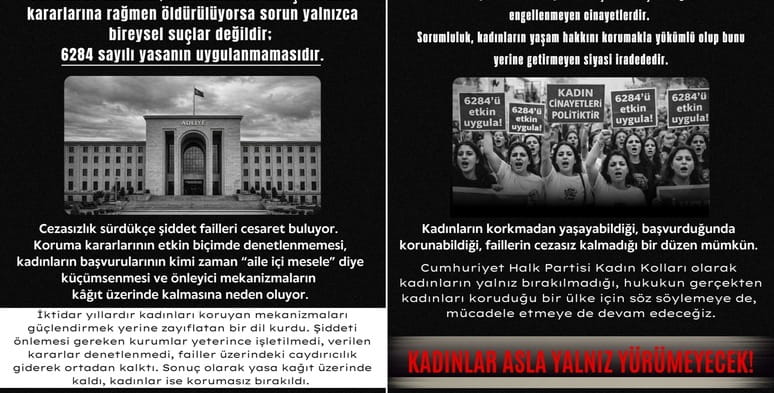 İktidar yıllardır kadınları koruyan mekanizmaları güçlendirmek yerine zayıflatan bir dil kurdu. Şiddeti önlemesi gereken kurumlar yeterince işletilmedi, verilen kararlar denetlenmedi, failler üzerindeki caydırıcılık giderek ortadan kalktı. Sonuç olarak yasa kağıt üzerinde kaldı, kadınlar ise korumasız bırakıldı.