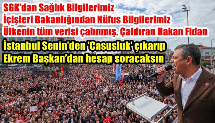 CHP Genel Başkanı Özgür Özel, “Bizim burada olmamız, Ekrem Başkan’a atılan yeni bir iftira yüzünden. Ancak bu iftiraya, bu yalana ne gerek var? Şundan gerek duyuyorlar: ‘Hırsız’ dediler, olmadı. ‘Yolsuz’ dediler, olmadı. ‘Teröre destek’ dediler, olmadı. Şimdi son çare ‘casus’ demeye kalktılar. Yazıklar olsun… Dışişleri Bakanı MİT Başkanıyken, Hakan Fidan MİT’teki bütün bilgileri çaldırmış. Aynı dönemde Gelir İdaresi’nden gelir ve vergi bilgilerimiz, SGK’dan sağlık bilgilerimiz, İçişleri Bakanlığından nüfus bilgilerimiz, sekiz bakanlık ve kurumdan bütün bilgilerimiz çalınmış. Türkiye’nin bütün verisi çalınmış, onu çaldıran Hakan Fidan. İlk başta susmuş. İbrahim Kalın gelince ağır cezaya suç duyurusunda bulunmuş. Dava açılmış. O dava sürüyor. Hakan Fidan’a ‘Neden çaldırdın?’ diyen yok. Bakanlara ‘Neden çaldırdın?’ diyen yok. Bakanlara ‘Neden çaldırdın?’ diyen yok. Erdoğan’a ‘Senin bakanların, MİT Başkanın bu verilere niye sahip çıkmadı?’ diyen yok. Daha burada İstanbul Senin’den, İstanbullunun binerken çıkan dıt dıt sesinden casusluk çıkaracak adamın alnını karışlarım ben.” dedi.