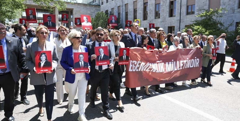 CHP Grup Başkanvekili Gökhan Günaydın ve CHP milletvekilleri TBMM’den Adalet Bakanlığı’na ellerinde tutuklu belediye başkanlarının fotoğrafları ve “Egemenlik milletindir” pankartıyla yürüdü. Adalet Bakanlığı’nın önünde açıklama yapan CHP’li Günaydın, şunları dile getirdi: