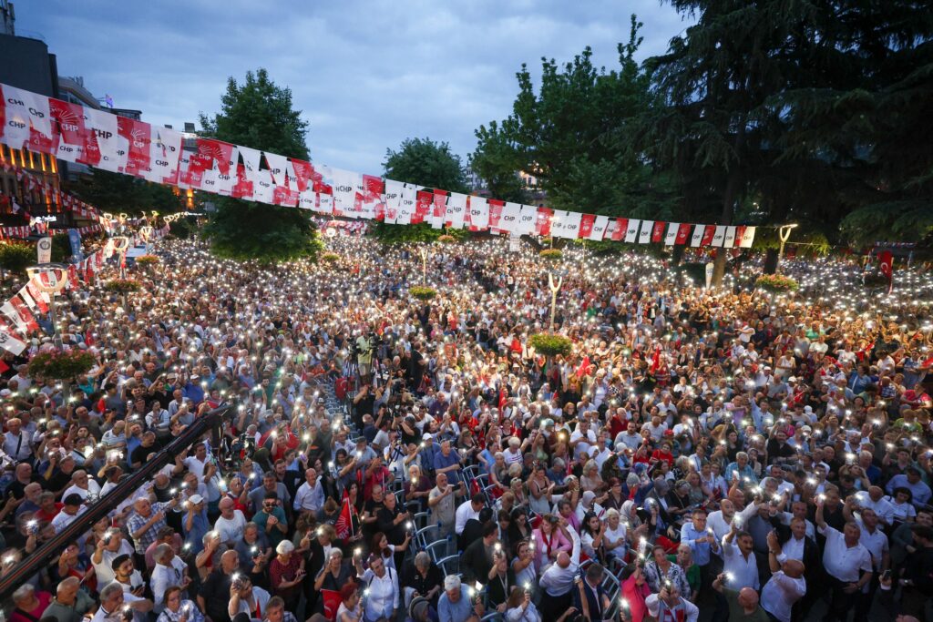 “Gecenin sürprizi, geçen ay tüm anketlerde Cumhuriyet Halk Partisi önünde olunca AK Parti ilk kez yüzde 30’un altına düşünce, anket şirketlerine baskılar yapanlar, ‘Bizi önde çıkarın’ diyenler temmuz anketlerini bekliyordu. Bugün temmuzun hem de yılda iki kez yapılan, 15 bin denekle yapılan şaşmaz anketinde Cumhuriyet Halk Partisi 0.5 puan daha geçen ayki ölçümlere ilerleyerek, AK Parti yüzde 29’luk AK Parti yüzde 28.4’e gerileyerek, Ekrem Başkan’a inananlar her ay olduğu gibi üç puan daha artarak, iftiraya inananlar iki puan daha azalarak. Biz bu ay da bu mücadeleden, bu direnişten alnımızın akıyla çıktık. Helal olsun hepinize. Selam olsun Edirne’den Kars’a kadar, Sinop’tan Anamur’a kadar, Antalya’dan Artvin’e kadar bu memlekette direnenlere selam olsun. Mücadeleye selam olsun. Biz kazanacağız, Cumhuriyet kazanacak, yoksullar, işçiler, işsizler, esnaflar, çiftçiler kazanacak. Trabzon kazanacak, İmamoğlu kazanacak, Türkiye kazanacak. Buna inanıyor musunuz? Artık adayımız belli, 15,5 milyon oyla seçtik onu. Silivri’den çıkamıyor. Gezemiyor. Dolaşamıyor. Onun yerine her sabah yataktan bir Cumhurbaşkanı Adayı olarak kalkmaya hazır mıyız? Ekrem Başkan yerine Yeliz gibi ev ev, kapı kapı, sokak sokak gezip çalışıp bu seçimi kazanacak mıyız? Hazır mıyız? Yürüyelim mi? Haydi o zaman yürüyelim arkadaşlar. Yürüyelim arkadaşlar. Yürüyelim, yolumuz açık olsun. Biz başaracağız.”