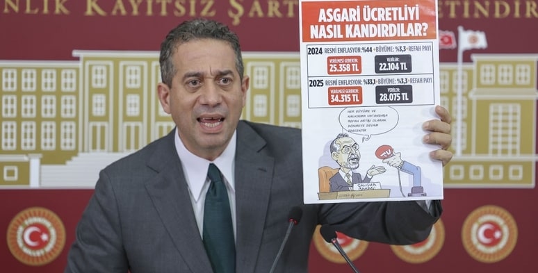 “Bakın bütçe görüşmeleri dahil bir yıl boyunca asgari ücretliyi dolandırırlar, kandırırlar. Niye? 2024’te bunu söyledik. Bakın 2024 resmi enflasyon yüzde 44. Büyüme 3,3 artı refah payı. Verilmesi gereken 25 bin 358 lira. Ne verildi? 22 bin 104 lira. Geliyorum 2025: Resmi enflasyon 33,1 artı büyüme 3,3 artı refah payı. Verilmesi gereken 34 bin 315 lira, 28 bin 75 lira verilmiş. Bunu rakamlar söylüyor, bilim söylüyor, akıl söylüyor. Sefer Selvi’nin çok güzel de bir karikatürü var. Bakanın karikatürünü yapmış. Her büyüme ve kalkınma vatandaşa refah artışı olarak dönmeye devam edecektir. Bu bakan geldi, asgari ücretlinin sorunlarından bahsetmedi.”