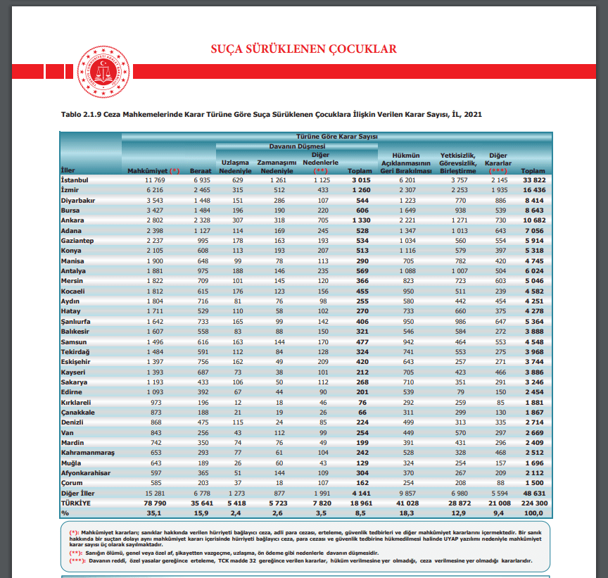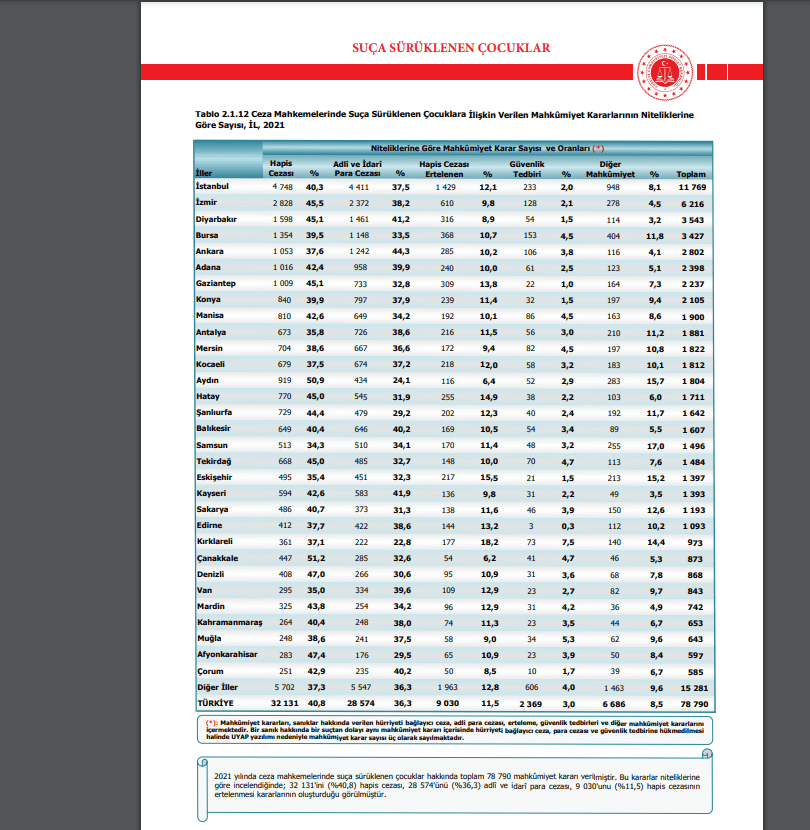 İstanbul’da çocuklara ilişkin 2021 yılında, 33 bin 822 dosyadan toplam, 11.769 Mahkûmiyet kararı veriliyor bu çocuklardan 4748’i hapis cezası alıyor.