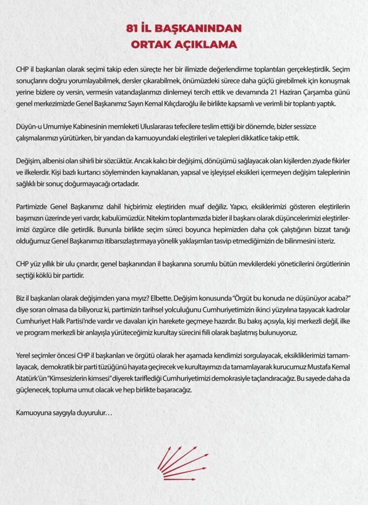 “CHP il başkanları olarak seçimi takip eden süreçte her bir ilimizde değerlendirme toplantıları gerçekleştirdik. Seçim sonuçlarını doğru yorumlayabilmek, dersler çıkarabilmek, önümüzdeki sürece daha güçlü girebilmek için konuşmak yerine bizlere oy versin, vermesin vatandaşlarımızı dinlemeyi tercih ettik ve devamında 21 Haziran Çarşamba günü genel merkezimizde Genel Başkanımız Sayın Kemal Kılıçdaroğlu ile birlikte kapsamlı ve verimli bir toplantı yaptık. Duyun-u Umumiye Kabinesinin memleketi uluslararası tefecilere teslim ettiği bir dönemde, bizler sessizce çalışmalarımızı yürütürken, bir yandan da kamuoyundaki eleştirileri ve talepleri dikkatlice takip ettik.