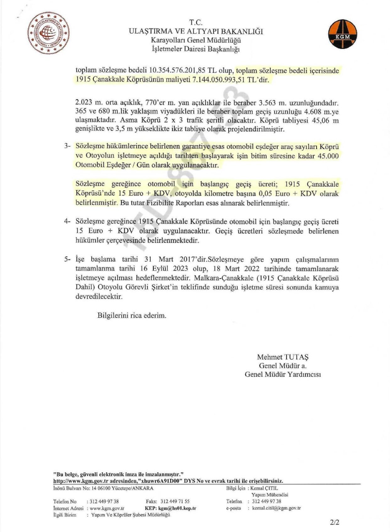 4-9 Haziran arasındaki 6 günlük bayram süresince garanti edilen araç geçiş sayısı 270 bin adet araç. Gerçekleşen araç geçiş sayısı ise 89 bin 537. AKP’nin hata payı yüzde 67. Hazine’nin şirkete ödeyeceği garanti tutarı 3 milyon 834 bin avro. Ortalama kur ile 153 miyon lira. Çanakkale Köprüsü’nün açılış tarihi 18 Mart 2022. kamuya devir tarihi 28 mayıs 2034. Garanti edilen günlük araç sayısı 45 bin adet. Garanti edilen 15 euro artı KDV x Avrupa Birliği enflasyon farkı. Yani vatandaşımızın sırtına hem Türkiye’deki enflasyon farkı onun üzerine de Avrupa Birliği enflasyon farkı Çanakkale Köprüsü geçiş ücretiyle yüklenmiş oluyor.”