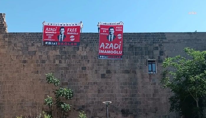 Silivri’deki Marmara Cezaevi’nde tutuklu bulunan CHP’nin Cumhurbaşkanı adayı Ekrem İmamoğlu için CHP Bağlar İlçe Başkanlığı tarafından Diyarbakır surlarına “Azadi İmamoğlu” ve “Free İmamoğlu” pankartları asıldı.