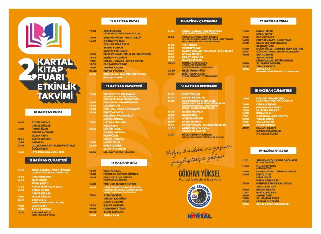 Gündüz programlarında birbirinden değerli yazarların söyleşileri ile imza etkinliklerinin olacağı Kartal Kitap Fuarı, akşamları saat 21.00’da çeşitli performans ve konserlerle renklenecek. Fuarda ayrıca Faruk Duman’ın Kartal’da yaşanan bir aşk hikâyesinden esinlenerek kaleme aldığı ‘Ayazma Kahvesi Âşıkları’ isimli yeni romanının da lansmanı gerçekleşecek. 19 Haziran Pazar günü olan fuarın kapanışı ise Erdal Erzincan konseri ile yapılacak.