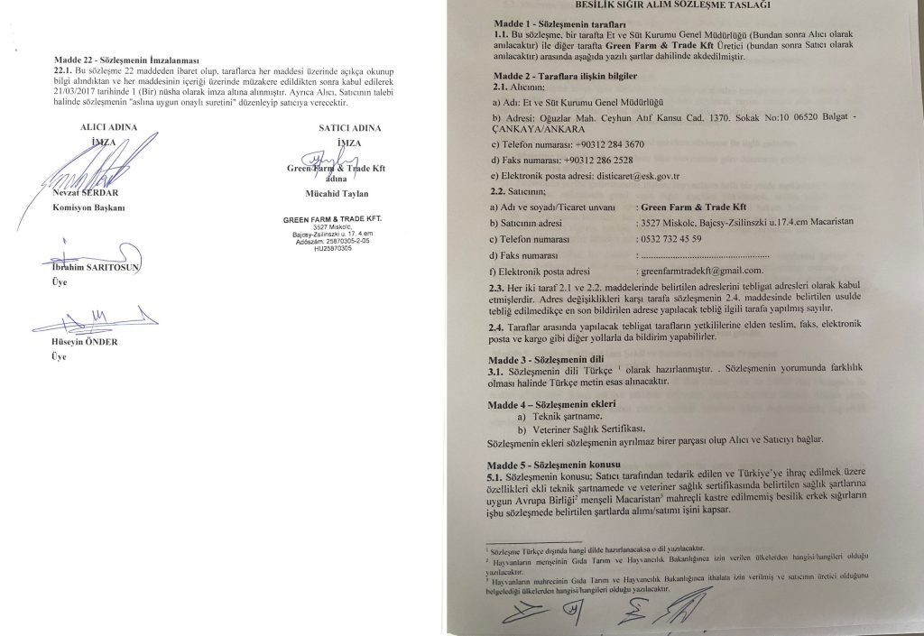 Bugün ortaya koyduğumuz resmî sözleşme, hem Genel Müdür’ün hem de Bakan’ın bu açıklamalarını çöp sepetine göndermektedir. Et ve Süt Kurumu ile Mücahid Taylan’ın Ortağı Olduğu Macaristan’daki şirket arasında elimizdeki belge, Et ve Süt Kurumu ile Macaristan merkezli Green Farm & Trade Kft arasında yapılan 2 bin adet besilik sığır ithalatı sözleşmesidir. Ve bu sözleşmede satıcı firma adına bizzat Mücahid Taylan’ın imzası bulunmaktadır. Sözleşme; ithal edilecek hayvan sayısını, nakliye ve sigorta şartlarını, teslim programını, canlı ağırlık, ödeme ve kalite kriterlerini, teslim koşullarını ve tüm ticari hükümleri tek tek düzenlemektedir. Bu, ‘niyet belgesi’ değildir. Bu, ‘ön anlaşma’ değildir. Bu, Et ve Süt Kurumu ile Taylan’ın şirketi arasında yapılmış tam teşekküllü bir ithalat sözleşmesidir.