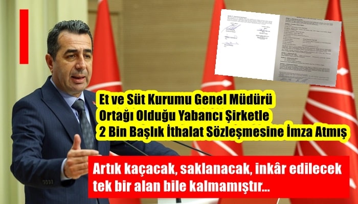 CHP Genel Başkan Yardımcısı Erhan Adem, “Et ve Süt Kurumu Genel Müdürü, ortağı olduğu yabancı şirketle 2 bin başlık ithalat sözleşmesine imza atmış; bugün ortaya koyduğumuz sözleşme, Mücahid Taylan’ın ve Tarım Bakanı’nın tüm inkârlarını çökerten resmî belgedir. Bu tablo artık devlet ciddiyetiyle bağdaşmamaktadır” dedi.