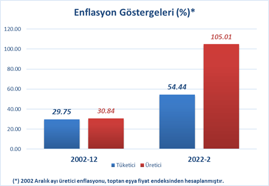 İş başına geldiklerinde nasıl başladılar? 2002 sonunda Tüketici Enflasyonu yüzde 29,75, Üretici Enflasyonu yüzde 30,84’tü. Şimdi nasıl gidiyor? 2022 Şubatında Tüketici Enflasyonu yüzde 54,44, Üretici Enflasyonu yüzde 105,01.