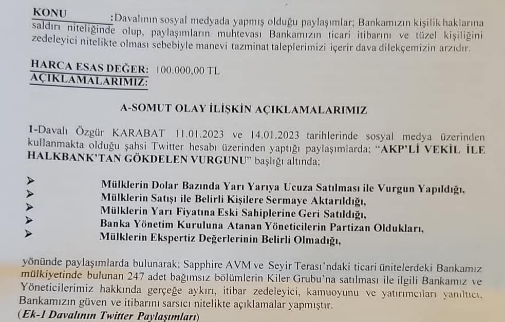 CHP İstanbul Milletvekili Özgür Karabat, AKP Bitlis Milletvekili Vahit Kiler’in şirketi ve Halkbank’la ilgili yolsuzluk iddialarının ardından hakkında 100 bin TL’lik tazminat davası açıldığını ve tweetlerime erişim engeli getirildiğini açıkladı.