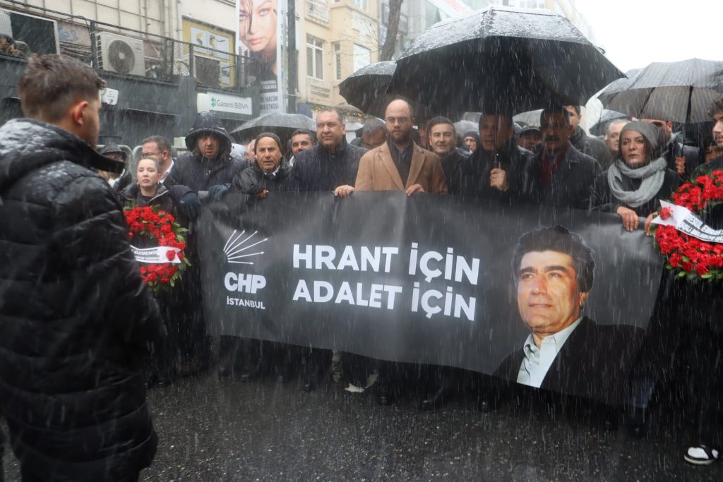 19 Ocak 2007’de gazete önünde düzenlediği silahlı saldırıda öldürülen Hrant Dink katledilişinin 19.yıl dönümünde yağan yoğun kar ve soğuk havaya rağmen sevenleri tarafından Şişli Halasgargazi Caddesi üzerinde bulunan ve öldürüldüğü Agos Gazetesi önünde anıldı.