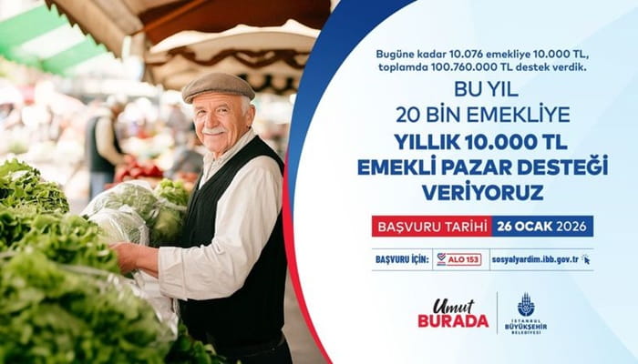 İstanbul Büyükşehir Belediyesi (İBB), artan hayat pahalılığı karşısında geçim mücadelesi veren emeklilere yönelik sosyal desteklerini sürdürmeye devam ediyor. Bu kapsamda hayata geçirilen Emekli Pazar Desteği başvuruları 26 Ocak 2026 itibarıyla başladı. 2026 yılında 20 bin emekliye kişi başı 10 bin TL destek sağlanacak. Başvurular Sosyal ve Ekonomik Destek Programı (SEDEP) web sitesi ve Alo 153 Çözüm Merkezi üzerinden yapılacak.