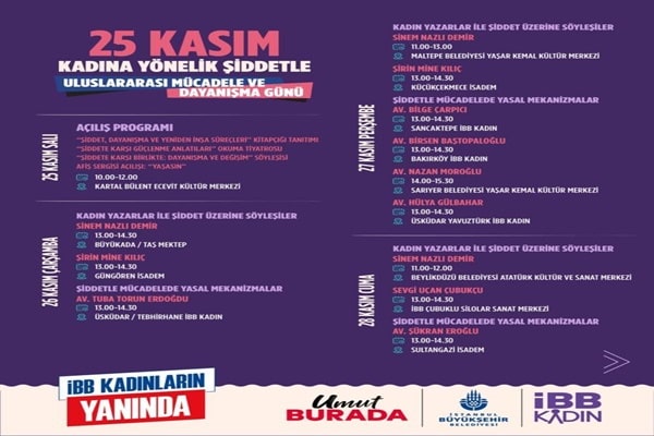İBB, ‘25 Kasım Kadına Yönelik Şiddete Karşı Uluslararası Mücadele Günü’ kapsamında “İBB Kadınların Yanında” diyor. İBB, “Şiddet, Dayanışma ve Yeniden İnşaa Süreçleri” kitapçığını İstanbul’un 39 ilçesinde tanıtacak, kadın yazarlar ve hukukçuları İstanbullular ile buluşturacak. Etkinlikler 10 Aralık tarihine kadar sürecek.