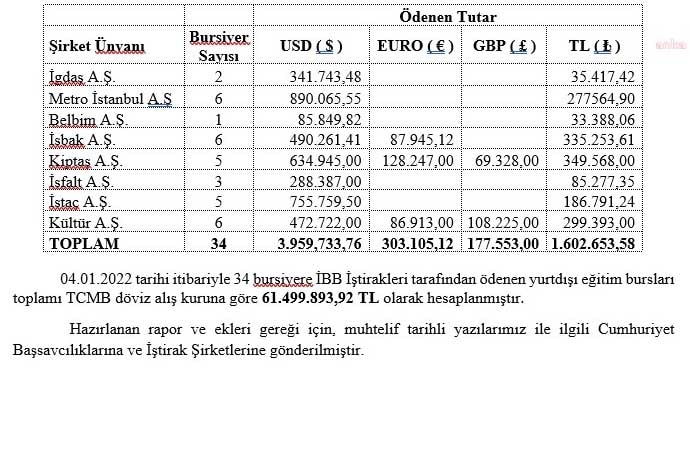 İBB Teftiş Kurulu, Belediyenin AKP tarafından yönetildiği dönemde 34 kişiye 61 milyon 499 bin 893 TL burs verildiğini tespit etti. Usulsüz olarak verilen burslarla ilgili savcılığa başvuruldu.