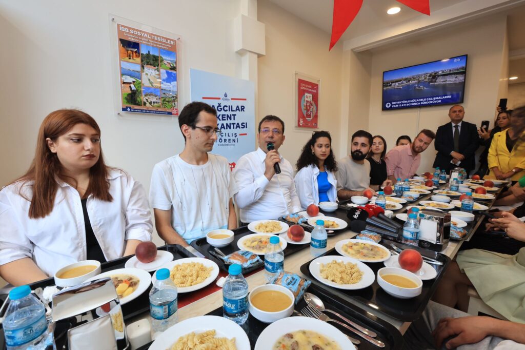 “Burada temel sebep şu” diyen İmamoğlu, “Bugün ekonomik koşullar, zorluklar, ne yazık ki iyi yönetilmeyen ekonomik süreç, döviz kurları, maliyetler, insanların ücretlerinin ne yazık ki yeterli seviyede olmaması her aileyi, her bireyi etkiliyor. Burada bizim en temel gördüğümüz, etkilendiğini hissettiğimiz ve mutlak yanında olmamız gerektiğini düşündüğümüz; başta burada gördüğünüz gibi öğrenci arkadaşlarımız olmak üzere, çok düşük ücretle çalışan işçi, emekçi dostlarımıza dönük alanlarda hizmet vermek. Ve bunda kararlıyız? Bu, bugünün sorunu, bugünün konusu; bunun aşılması lazım. ‘Ekonomi iyi yönetilmiyor, bu hükümetin sorunu’ deyip, kenara çekilenlerden olamayız. Elimizdeki imkanlarla, ‘Bugünün zor koşularının atlatılmasında mutlaka bizler de bir şey yapmalıyız’ diyerek, yola çıktık” ifadelerini kullandı.