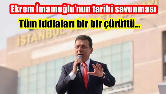 İmamoğlu, “Burada suçlamaya geldim. Suçluyorum. Adaletsizliği suçluyorum. Milleti aldatanları, yargıyı, siyasetin aracı haline getirenleri suçluyorum. Ki birazdan dosyayla ilgili de nasıl aldatma unsurlarını harekete geçirdiklerini tek tek ifade edeceğim. Siyasetin gücüne, adalet erkini tereddütsüz teslim edenleri suçluyorum. Bu suçu işleyenlerin de mutlaka hukukun önünde hesap vermesi gerektiğine yüzde yüz inanıyorum. Ve bu adaletsizliğe imza atan, adaletsiz uygulamalara imza atan kişilerin de bu salonlarda, adil yargının olduğu günlerde, çatır çatır hesap vereceği günlerin de çok yakın olduğunun altını çizmek istiyorum.” dedi.