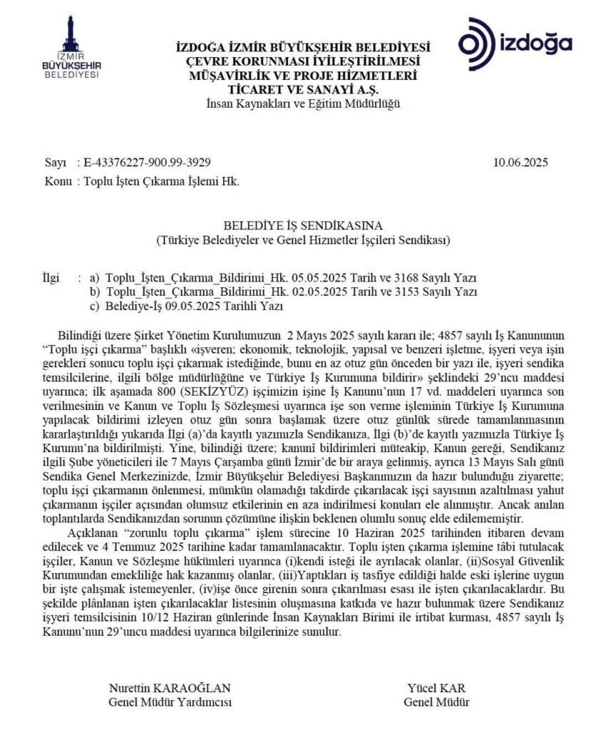 İzmir Büyükşehir Belediyesi’nde tartışmalı ve sancılı toplu iş sözleşmesinin ardından 1030 kişi işten çıkarılıyor. İzBB Başkanı Tugay, işçi giderlerini karşılayamadıklarını söyledi. Cemil Tugay mevcut şartlarda bu ücretin verilemeyeceğini savunarak “Sendika yüksek ücret için işçileri feda ediyor” ifadelerini kullandı.