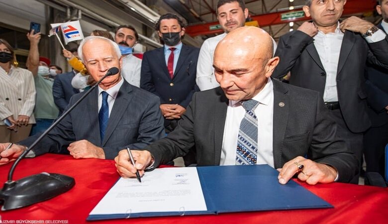 İzmir Büyükşehir Belediyesi’ne bağlı Metro A.Ş. ile Demiryol İş Sendikası arasındaki 9’uncu dönem toplu iş sözleşmesi, Halkapınar İzmir Metro A.Ş. Genel Müdürlüğü’nde düzenlenen törenle imzalandı. Metro ve tramvay işletmelerinde farklı iş kollarında 627 çalışanı kapsayan ve en düşük maaşın brüt 4 bin 856 TL’den, brüt 7 bin 553 TL’ye çıkarıldığı sözleşmenin imza törenine; İzmir Büyükşehir Belediye Başkanı Tunç Soyer, Demiryol- İş Sendikası İzmir Şube Başkanı Hamdullah Giral, Türk İş 3. Bölge Temsilcisi Hayrettin Çakmak, İzmir Metro A.Ş. Genel Müdürü Sönmez Alev, İzmir Metro A.Ş Yönetim Kurulu Başkanı Raif Canbek ile sendika temsilcileri ve işçiler katıldı. Başkan Tunç Soyer, “Eşit işe eşit ücret”, “Halkçı Başkan”, “Büyük Başkan” sloganlarıyla ve “Güzel günler göreceğiz” sloganları ile karşılandı.