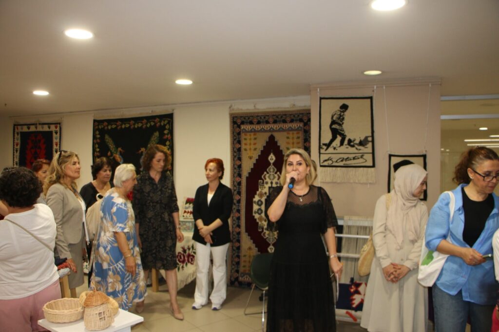 Konuşmaların ardından açılan sergide kursiyerlerin geçen yıl boyunca; halı, kilim, çini, sepet, giyim, mefruşat, kalıp, geleneksel el nakışları, iğne oyası, dekoratif ahşap boyaması, aşçı ve pasta yardımcılığı, kuaförlük, protez tırnak ve kalıcı makyaj gibi alanda yaptıkları eserler sergilendi. Sergi 20 Eylül’e kadar açık kalacak.