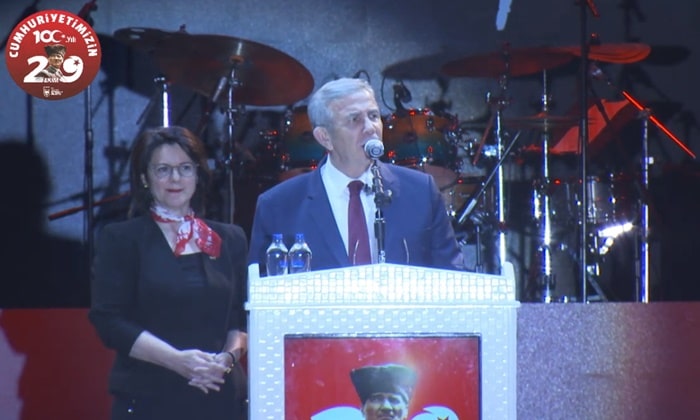 “Ankaralılar olarak Cumhuriyet coşkusunu iliklerine kadar hisseden hürriyet sevdalılarıyız. Çünkü biz, bir çift mavi gözde denizi, sapsarı saçlarda ışığı, ay yıldızlı bayrağımızda vatanı bulan aşıklarız. Çünkü biz, yedi düvele karşı gelen bir milletin düşmana ‘dur’ dediği toprakların çocuklarıyız. Ankara’yı büyük önder Mustafa Kemal Atatürk’e yakışır, dünya başkentleriyle yarışır bir kent haline hep birlikte getireceğiz. Sizler de destek olursanız seneye de 101. yılımızı Atatürk Orman Çiftliği’nde hep birlikte kutlayacağız. Yaşasın hürriyet, yaşasın Cumhuriyet, 100. yılımız kutlu olsun. Türk’üm diyemeyenlere inat, ne mutlu Türk’üm diyene”