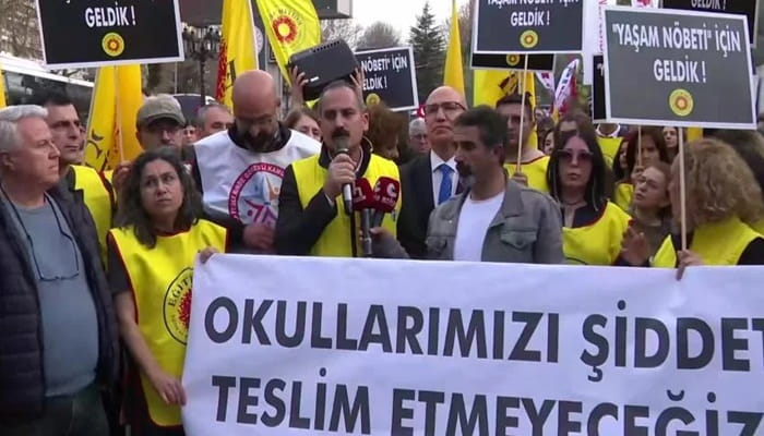 “Yaşam nöbeti için geldik” yazılı döviz taşıyan eğitimciler “Tarikatçı Bakan Yusuf Tekin istifa istifa, “Susma haykır şiddete hayır”, “Öğrenciler ölüyor bakan izliyor” ve “Eğitimde şiddet politiktir” sloganları attı.