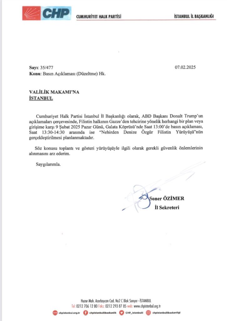 “Cumhuriyet Halk Partisi İstanbul İl Başkanlığı olarak, ABD Başkanı Donald Trump’un açıklamaları çerçevesinde, Filistin halkının Gazze’den tehcirine yönelik herhangi bir plan veya girişime karşı 9 Şubat 2025 Pazar Günü, Galata Köprüsü’nde Saat 13:00’de basın açıklaması, Saat 13:30-14:30 arasında ise “Nehirden Denize Özgür Filistin Yürüyüşü’nün gerçekleştirilmesi planlanmaktadır.”