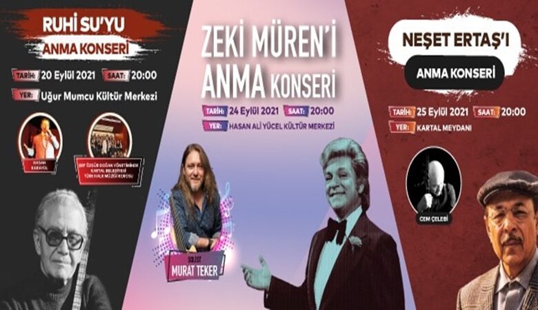 Türk müzik tarihine adını altın harflerle yazdırmış olan usta sanatçılar; Ruhi Su, Zeki Müren ve Neşet Ertaş, Kartal Belediyesi’nin organize ettiği “Ustalara Saygı Konserleri” kapsamında ölüm yıl dönümlerinde anılacak.